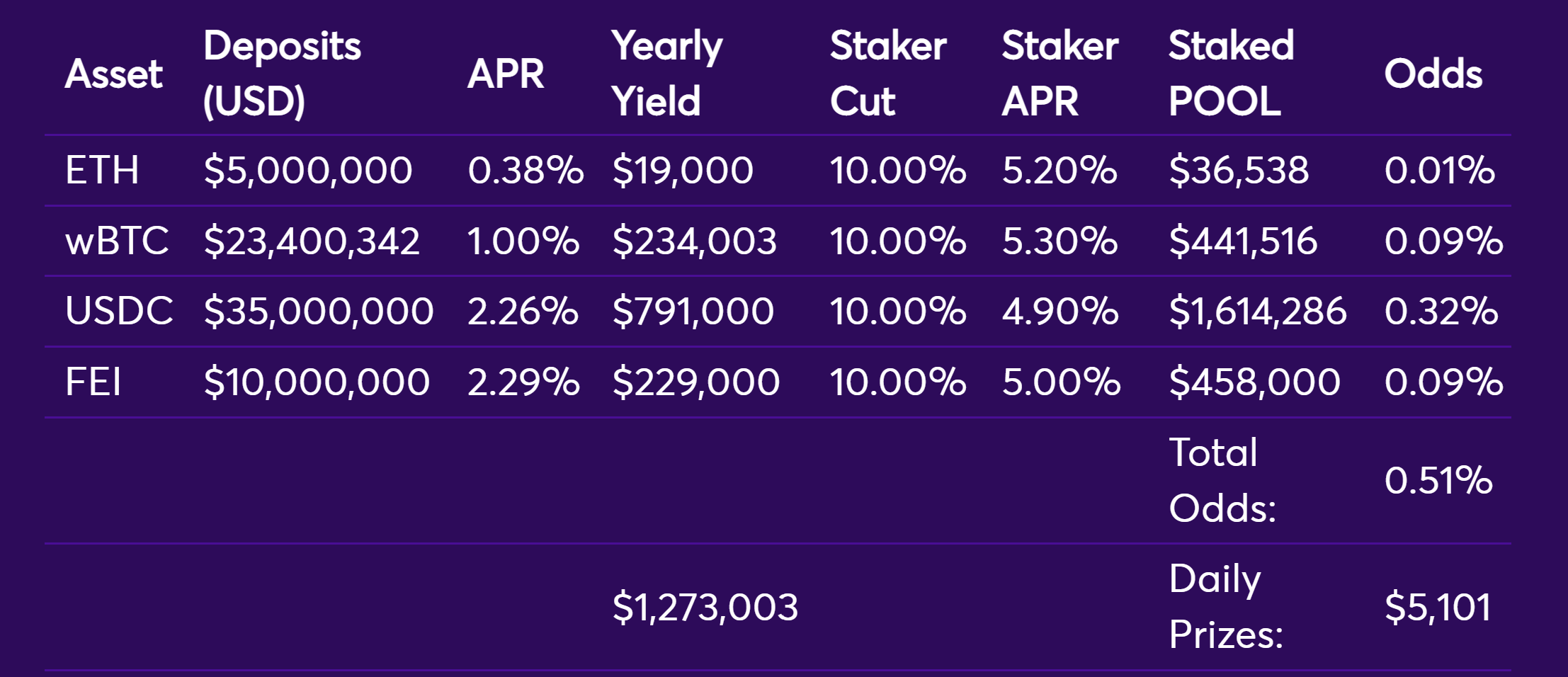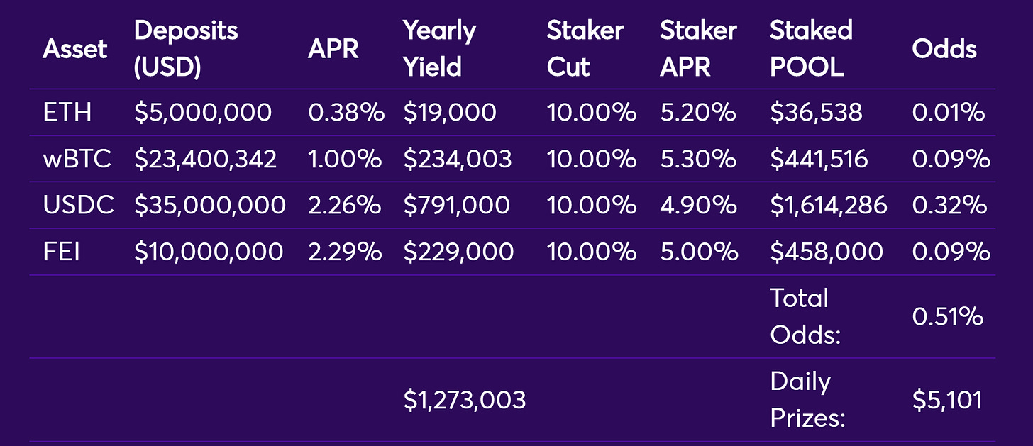 注意到Fei和wBTC奖池的TVL和APR不同,但赔率相同;这是因为它们的收益率大致相同,但庄家会确保他们的收益在各奖池中得到最大收益。